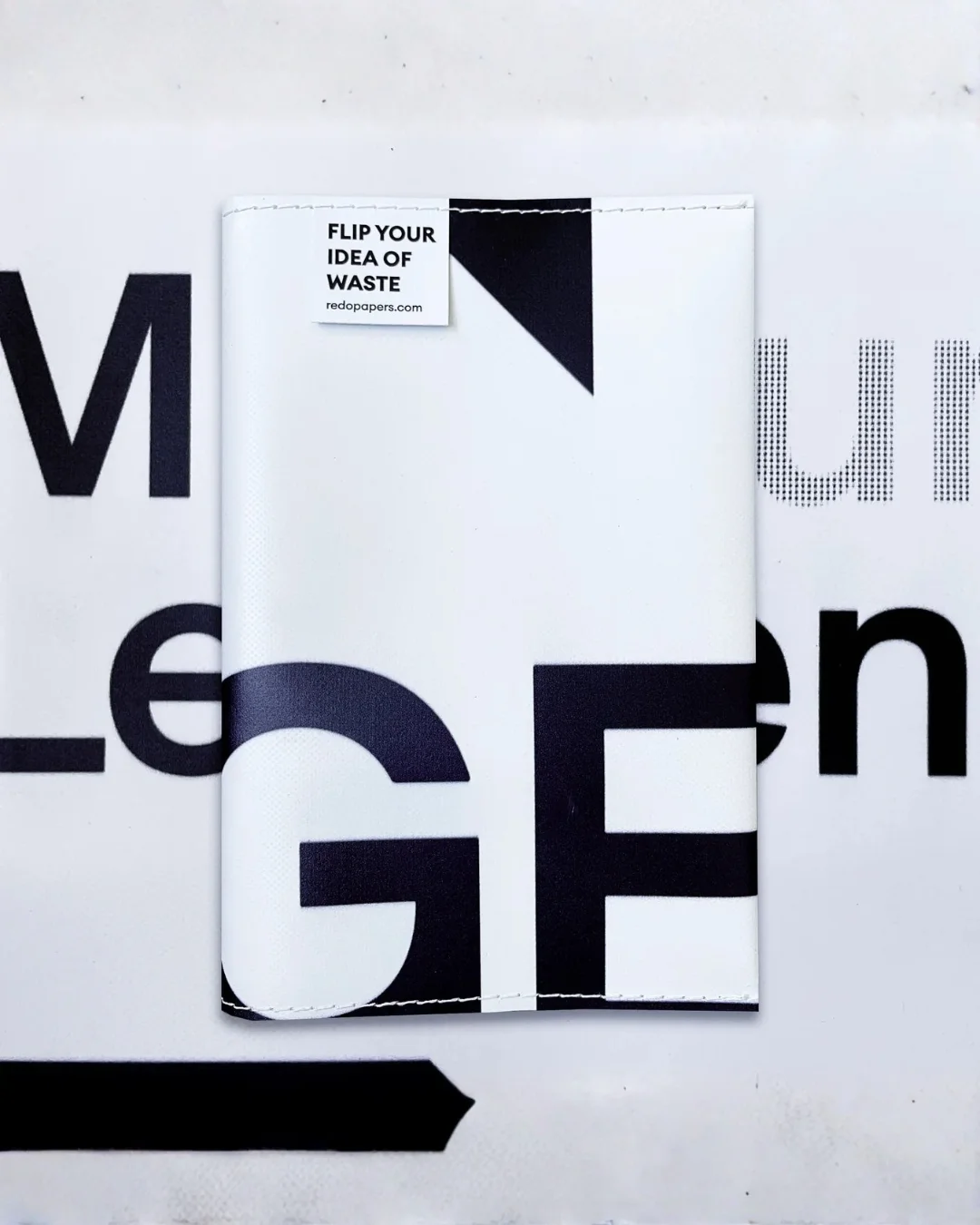This agenda combines a full yearly planner with a reusable cover made from upcycled advertising banners. Instead of a standard paper wrap that gets replaced every year, the cover is designed to stay in use.