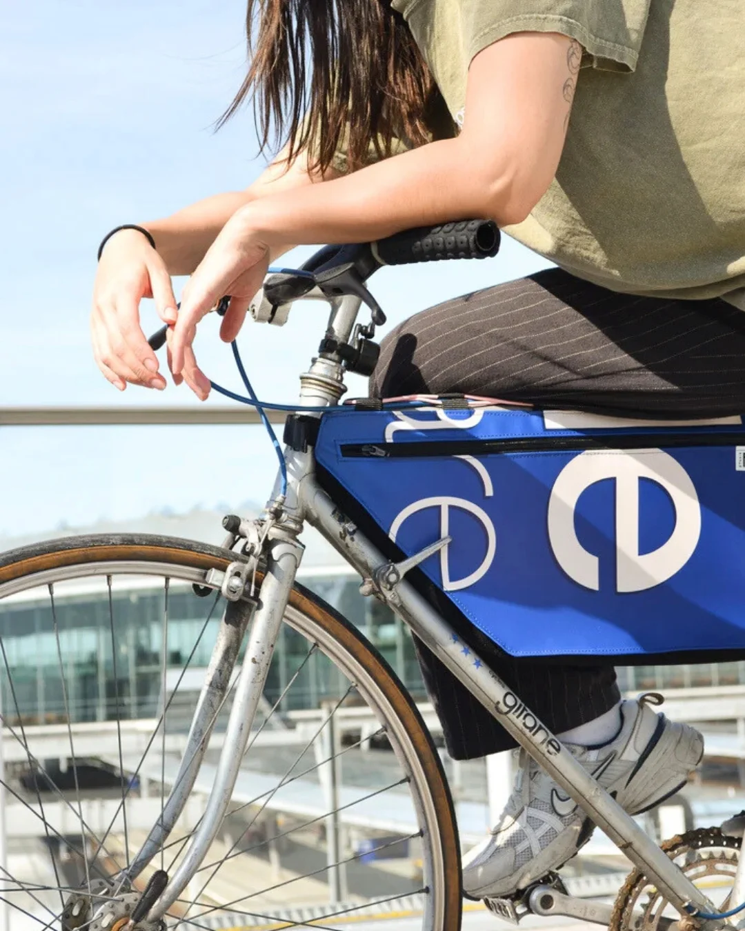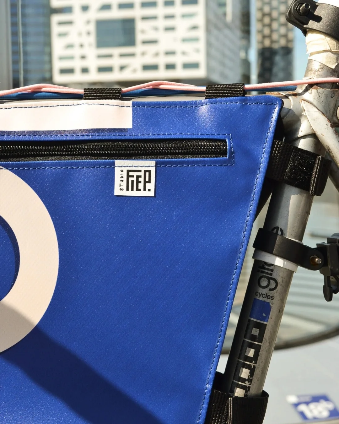 Bike frame bag made from upcycled festival banners by Studio Fiep, custom-built to fit your race bike and ready for everyday rides or longer adventures.