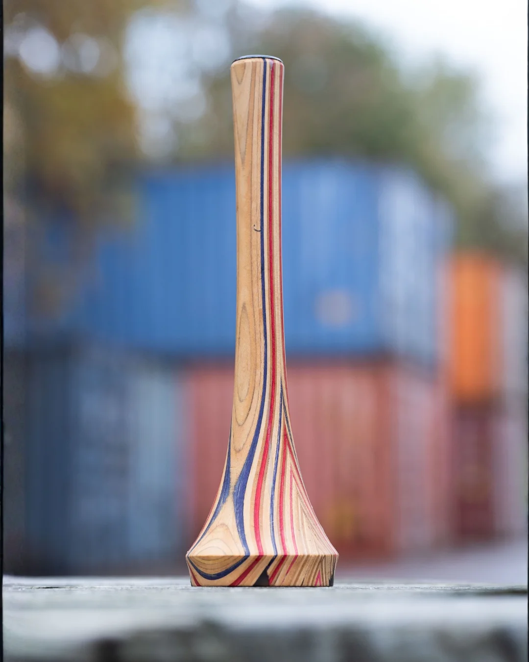 Skateboards are built from multiple thin layers of pressed maple wood, often dyed in different colours. When reshaped, those layers become visible as colourful stripes running through the material. In a tall candle holder form, those lines create a vertical pattern that feels graphic and balanced.