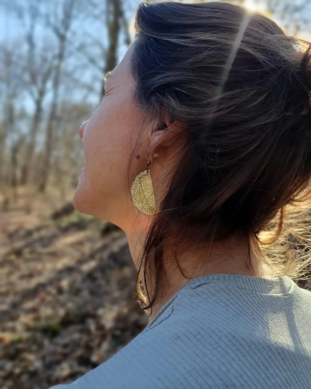 Each pair is crafted by hand. The metal keeps subtle traces of its past life, while being formed into a clean and balanced moon-inspired design. They feel light on the ear and easy to wear, whether you combine them with everyday outfits or something more dressed up.
