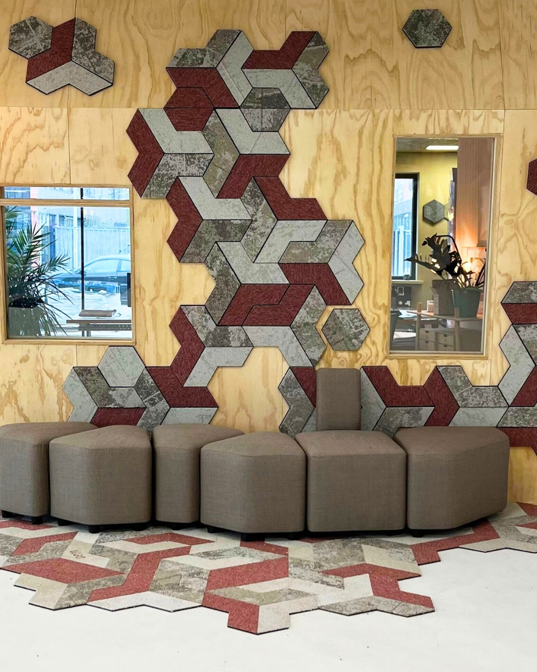 The material comes from production waste streams of and instead of being discarded, these leftovers are layered and structured into tiles that help absorb sound. The added thickness and open lines in the design improve acoustics while keeping the visual identity clear and flexible.
