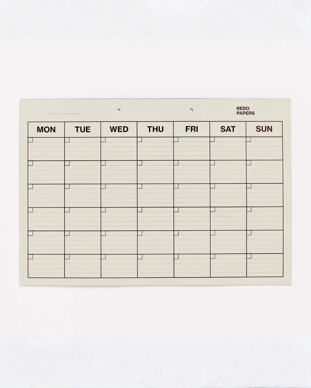 Redopapers produces it from 100% waste paper collected locally in Antwerp. The 13 large pages are glued into a tear-off pad. When the month ends, you remove the page and start fresh.
