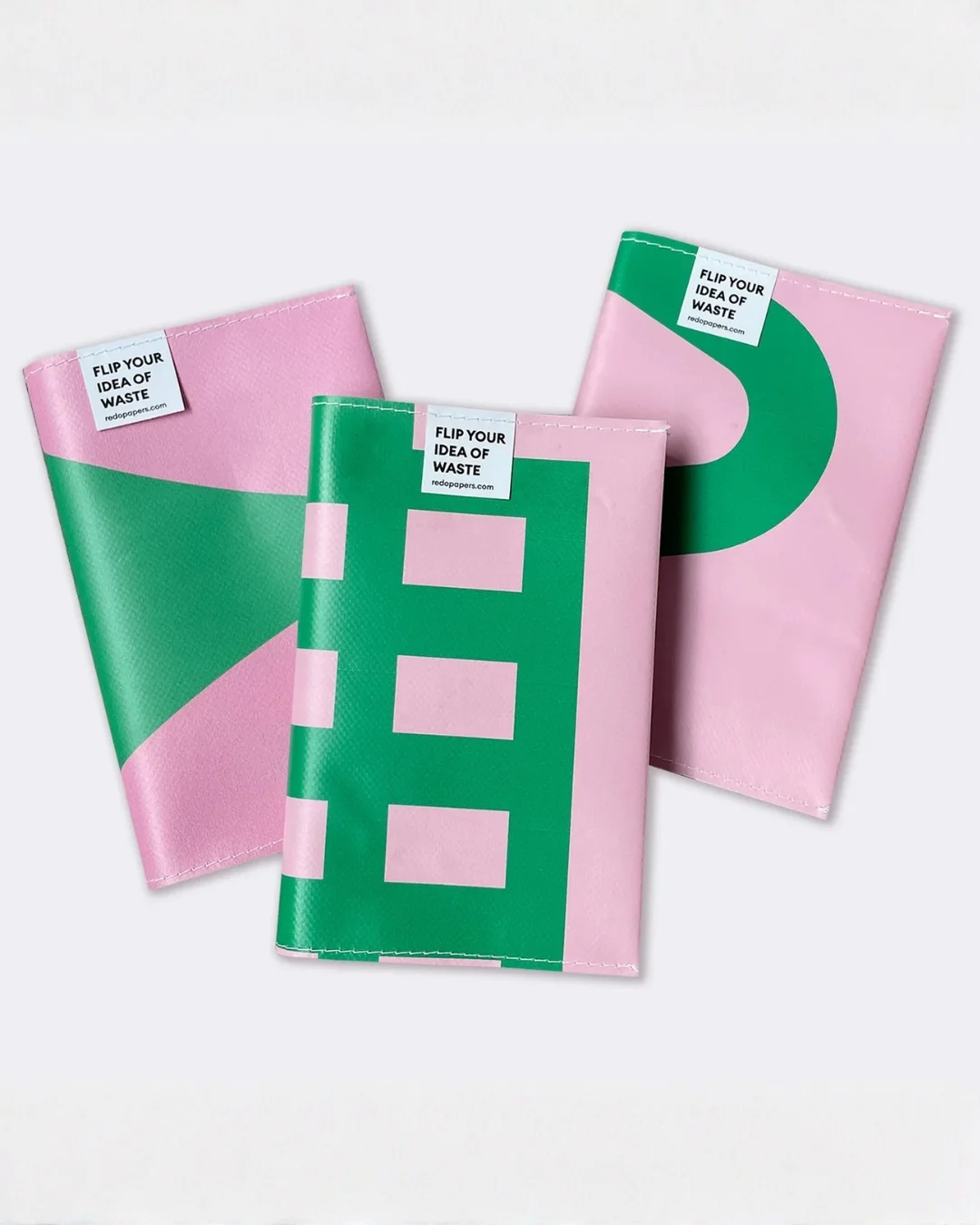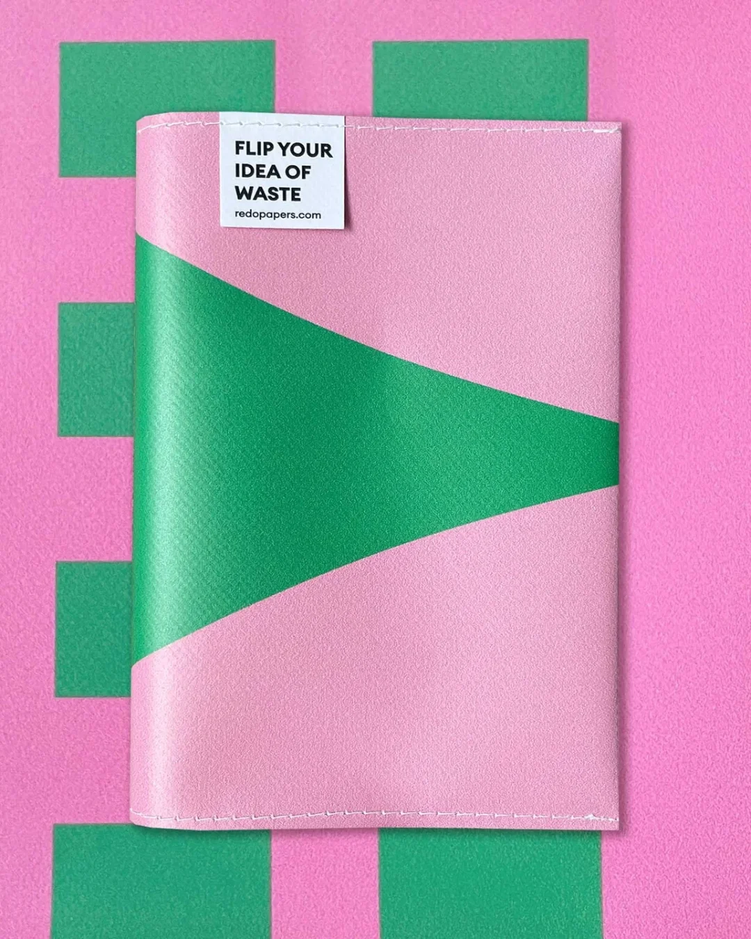 Notebook made from 100% waste paper and reused banners by Redopapers, with lay-flat Coptic binding and refillable cover.