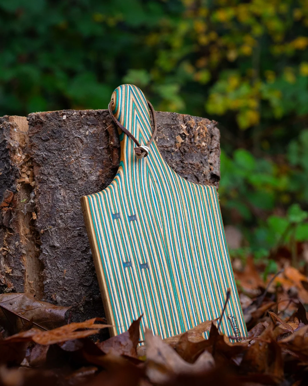 Cutting board made from reclaimed skateboards by Skateriors, featuring layered maple wood and visible colour stripes.