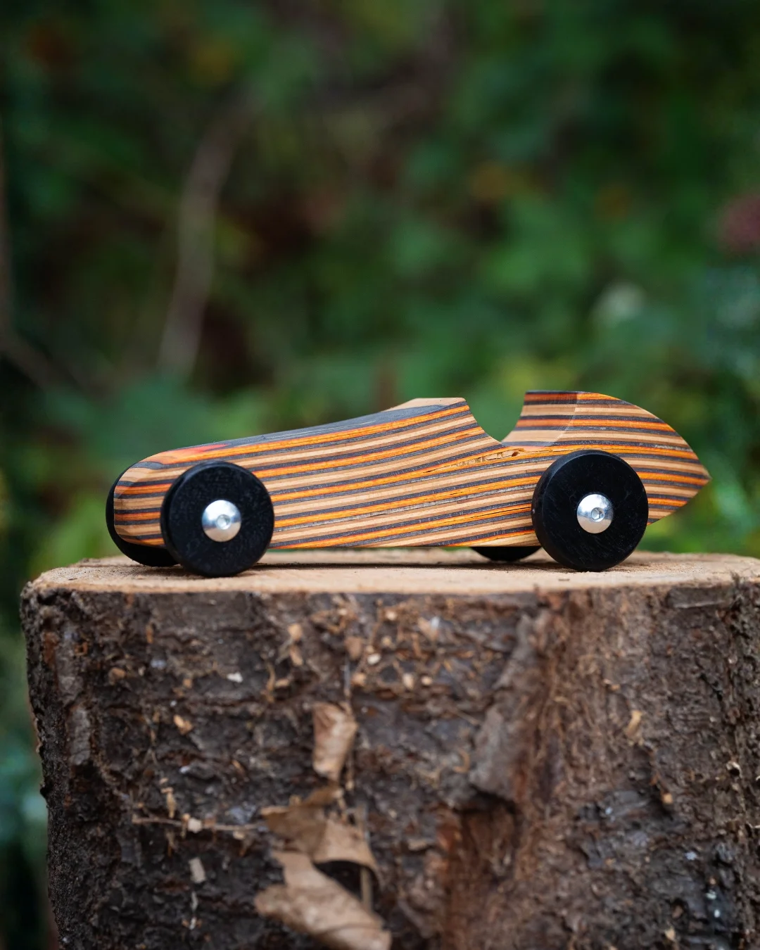 The layered maple construction of the deck becomes the highlight here. The coloured layers, originally pressed together to handle tricks and impact, now shape the body of a small car. The stripes run through the wood, making each piece look slightly different from the next.